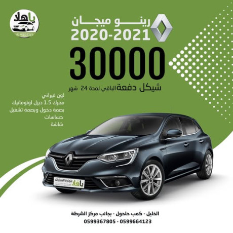 رينو ميجان 2021-2020.. سيارة الفخامة والتوفير صارت بين يديك! 🚗💨--ليش تستنى؟ في يا هلا كرز بنسهلها عليك. امتلك سيارة "رينو ميجان" بنظام دفع مريح جداً وبدون تعقيدات!--💰 دفعة أولى: 30,000 شيكل فقط.-💳 الباقي: تقسيط مريح لمدة 24 شهر.--المواصفات اللي رح تعجبك:-✅ محرك 1.5 ديزل أوتوماتيك (قوة وتوفير).-✅ لون فيراني مميز وجذاب.-✅ بصمة دخول وبصمة تشغيل لراحة تامة.-✅ إضافات كاملة: شاشة، حساسات، والعديد من المميزات.--📍 الموقع: الخليل - كمب حلحول - بجانب مركز الشرطة.-📞 للتواصل: 0599367805 | 0599664123
