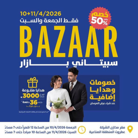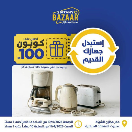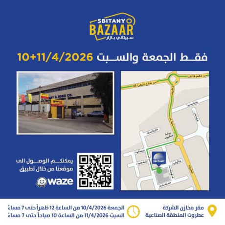 سبيتاني بازار راجع بأقوى العروض 💥 -فقط يومي الجمعة والسبت 10+11\4\2026 في مقر الشركة - عطروت!- 🎉 خصومات لحد 50% على أفضل الأجهزة الكهربائية -🎁 عروض وهدايا إضافية للعرسان - 🛒 استبدل جهازك القديم واحصل على كوبون مشتريات من البازار( الأجهزة الصغيرة فقط)-🪙 أقساط حتى 36 دفعة بدون فوائد -📍 لا تفوّتو الفرصة، بنستناكم من الساعة 12 ظهراً الجمعة و10 صباحاً السبت! -📲 موقعنا على https://waze.com/ul/hsv9j1r4ku Waze سبيتاني عطروت