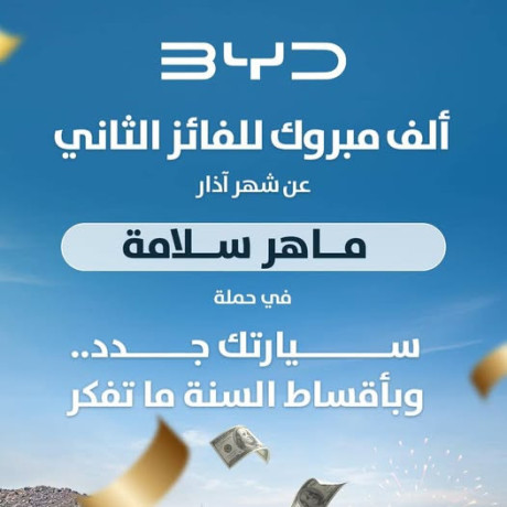 مبروك للفائز الثاني ماهر سلامة عن شهر آذار-ضمن حملة "سيارتك جدّد.. وبأقساط السنة ما تفكّر" --لسّا مكملين معكم، والفرصة لسه قدامكم!-السحب مستمر كل شهر لاختيار رابح جديد لغاية نهاية السنة 👌--لمعرفة المزيد من التفاصيل، تواصلوا معنا على الرقم: 7000#-أو زوروا معارضنا:-📍 الخليل - مقابل بئر حرم الرامة-📍 رام الله - البيرة - البالوع - دالاس سنتر-📍 نابلس - شارع صرّة--شركة eMobility الوكيل الحصري لسيارات BYD في فلسطين-Build Your Dreams-#BYD #BuildYourDreams #BYDEJOURNEY