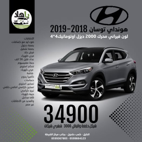هونداي توسان 2018-2019.-المحرك: 2000 ديزل - أوتوماتيك - 4x4.-اللون: فيراني مميز.--✅ المميزات: كراسي جلد، فتحة (جيبة كهرباء)، تحكم ستيرنج، مداخل USB، إضاءة LED، وكاميرا رجوع.-✅ الحالة: عداد 56 ألف، سيارة بحالة الوكالة.--💵 نظام الدفع:-دفعة اولى 34,900 شيكل والباقي تقسيط (3000 شيكل شهرياً).--📍 الموقع: الخليل - كمب حلحول - بجانب مركز الشرطة.-📞 للتواصل: 0599367805 | 0599664123
