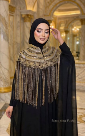 -A stylish black abaya featuring intricate gold detailing and a flowing design.
