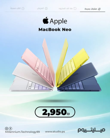 الخيار المثالي للاستخدام اليومي بكل سلاسة 💻✨- الجديد من شركة أبل MacBook Neo -✔️ سرعة وكفاءة عالية لكل مهامك اليومية -✔️ ذاكرة 8GB لتعدد مهام بدون تعليق -✔️ سعة تخزين 512GB لكل ملفاتك-🎨 متوفر لدينا بكل ألوانه--📏 القياس: 13 إنش-💵 السعر: 2,950 شيكل--📞 للاستفسار والتواصل:-📱 0599202402-☎️ 092333742-📍 نابلس - شارع سفيان-مجمع سفيان التجاري - الطابق الثالث-www.studio.ps 🌐- 🚚 توصيل متاح لجميع مناطق الضفة