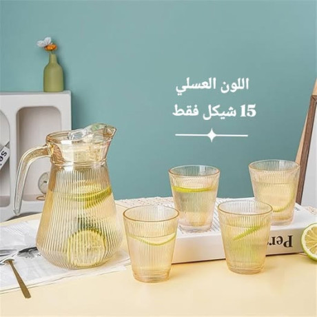 -A stylish pitcher with four matching glasses, perfect for serving beverages.