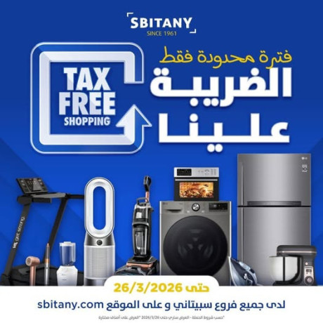 - اليوم القرار الصح = توفير أكيد!--💥 TAX FREE-إحنا علينا الضريبة… وإنت بس اختار!--✨ كل اللي بدك إياه بسعر أقل-⏳ اشتري اليوم ووفّر بكرا--🚀 العرض لنهاية اليوم 26/3 — لا تخلّي الفرصة تفوتك--📍 تسوّق من فروع سبيتاني أو اطلب أونلاين-حسب الشروط